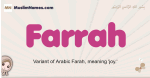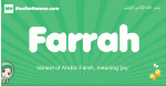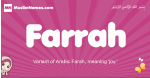 Meaning of Farrah is Variant of Arabic Farah, meaning 'joy.'