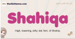 Meaning of Shahiqa is High, towering, lofty, tall, fem. of Shahiq.